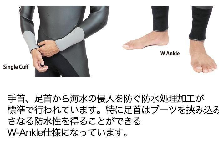 手首は圧迫感をおさえ内側にラバーを巻いた簡易防水加工処理、足首はブーツを挟み込めるW-Ankle仕様。